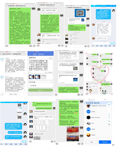 疫情防控期间每个人家里都成了临时办公室,随处都是办公桌,她们手机24小时不离手,电脑开机几天不关机,有时候甚至连一口热乎乎的饭菜都吃不上。她们“键对键”与学生“心连心”,密切掌握学生的实时动态,获悉身心健康状况。以多种形式与学生沟通,引导他们保持良好的心态,“点对点”给予支持帮助,增强学生的思想认同、防护意识和必胜信心。