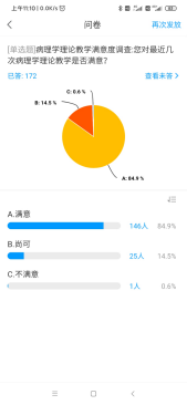 课后问卷调查收回问卷172份,结果显示,对于该种教学模式,84.9%的同学表示满意,14.5%的同学表示尚可,0.6%的同学(1名同学)表示不满意。绝大部分同学适应并喜欢这种授课模式。