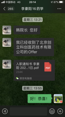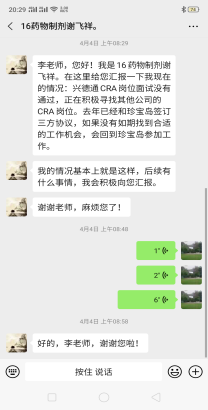 近期,我院举办了四场线上招聘会,参会企业分别是北京兴德通医药科技股份有限公司、北京博恩特制药有限公司、康龙化成(北京)新药技术有限公司、哈尔滨珍宝制药有限公司。参加招聘会的有药学院党委副书记兼副院长韩翠艳、辅导员李刚、董玉晶和药学院2020届毕业生176人次。上述企业提供就业职位近百个,我院学生积极投递简历,经过面试,已经有12人与上述企业签订就业协议。