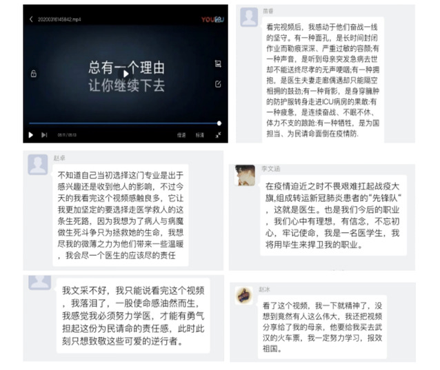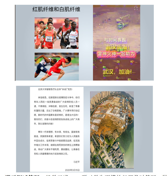 4、课程思政:以本节课为例,共三个思政点:①课前励志小视频,让学生讨论感谢,知道在遇到挫折的时候总有一个理由让你坚持下去。②第一个学时通过肌肉的健美引出运动与健康。运动的好处包括增加心肺功能、控制体重改善体型、减少老化现象(引入学生们的偶像钟南山,84岁的老人依然保持年轻态,在抗疫一线奋战,体力丝毫不输给年轻人,其中一个原因就是他一直坚持健身运动);另外,运动还可以消除精神紧张和压力、加快新陈代谢提高免疫力(在特殊时期,居家隔离期间有很多人出现了焦虑、不安的表现,而运动可以分泌多巴胺和内啡肽,可以使人产生快乐的感觉。提高免疫力更重要,新冠病毒感染后为什么有的人症状很轻,甚至不被感染,是因为自身免疫力强)。通过运动的好处,鼓励同学们多参加体育运动,虽然大家都在家隔离,但可以利用家里的空间做一些简单的运动。在方舱医院,护士们每天还带着患者运动。运动开始一定会觉得很累,想放弃,但是坚持一段时间以后,就会发现运动给你带来的改变。其实任何事都一样,不能半途而废,给自己定下一个目标,持之以恒的去努力就会有收获。③第二个学时通过肌纤维组成不同引出我国优秀的短跑运动员苏炳添,他为国家争得了很多荣誉,为“中国速度”贡献了新的力量。提到中国速度值得每一个中国人骄傲和自豪的是在这次疫情期间武汉建起来的火神山、雷神山医院,充分体现了中国速度和中国力量,震惊了世界,只有中国可以做到,激发学生爱国情怀。鼓励学生努力学习,不断充实自己,成为一名好医生,学成后为祖国贡献自己的一份力量,在祖国需要我们的时候,若有战,召必回,战必胜!同时结合一封习主席给北京大学援鄂医疗队90后党员的回信,鼓励青年一代要有理想、有本领、有担当,使学生深受鼓舞。
