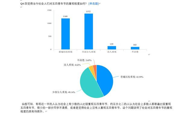 活动四为“传承五四精神,担当时代责任”五四青年节调查问卷。全校同学通过扫描二维码,回答问卷中的相关问题,如五四运动的起源,以及结合当今疫情现状青年身上体现的精神等,让青年学生更深刻理解“五四”精神内涵;活动结束后,共上交调查问卷截图2788份,并进行相关问卷分析。