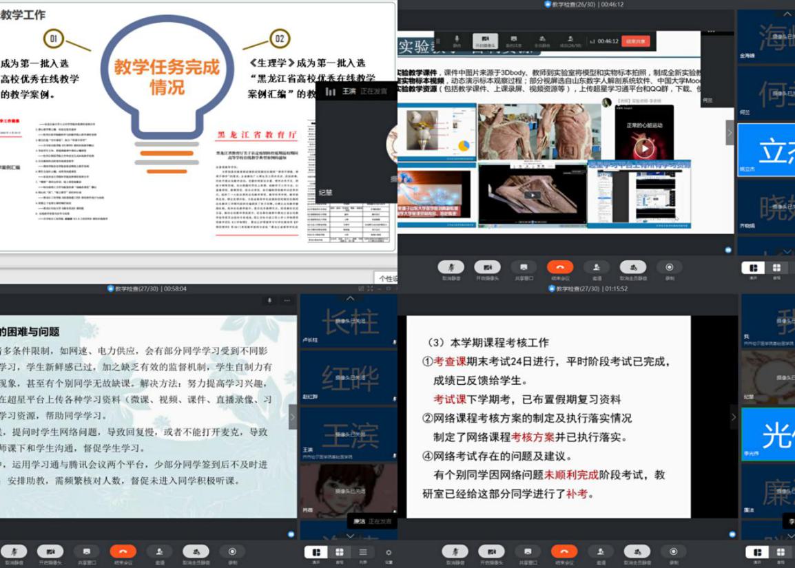 会议由基础医学院教学林岩副院长主持,主要分为三个部分。首先教研室、实验室主任汇报本学期在线教学总体情况,各部门负责人结合本部门教学工作自查情况,从理论教学、实验教学、考务工作等方面进行PPT汇报。重点介绍了在线教学过程中教学设计、课程思政及网络教学资源建设等特色工作以及教学过程中遇到的问题和解决方案。各部门均能克服困难,并根据课程特点,发挥自身优势,平稳有序高质量完成教学任务。