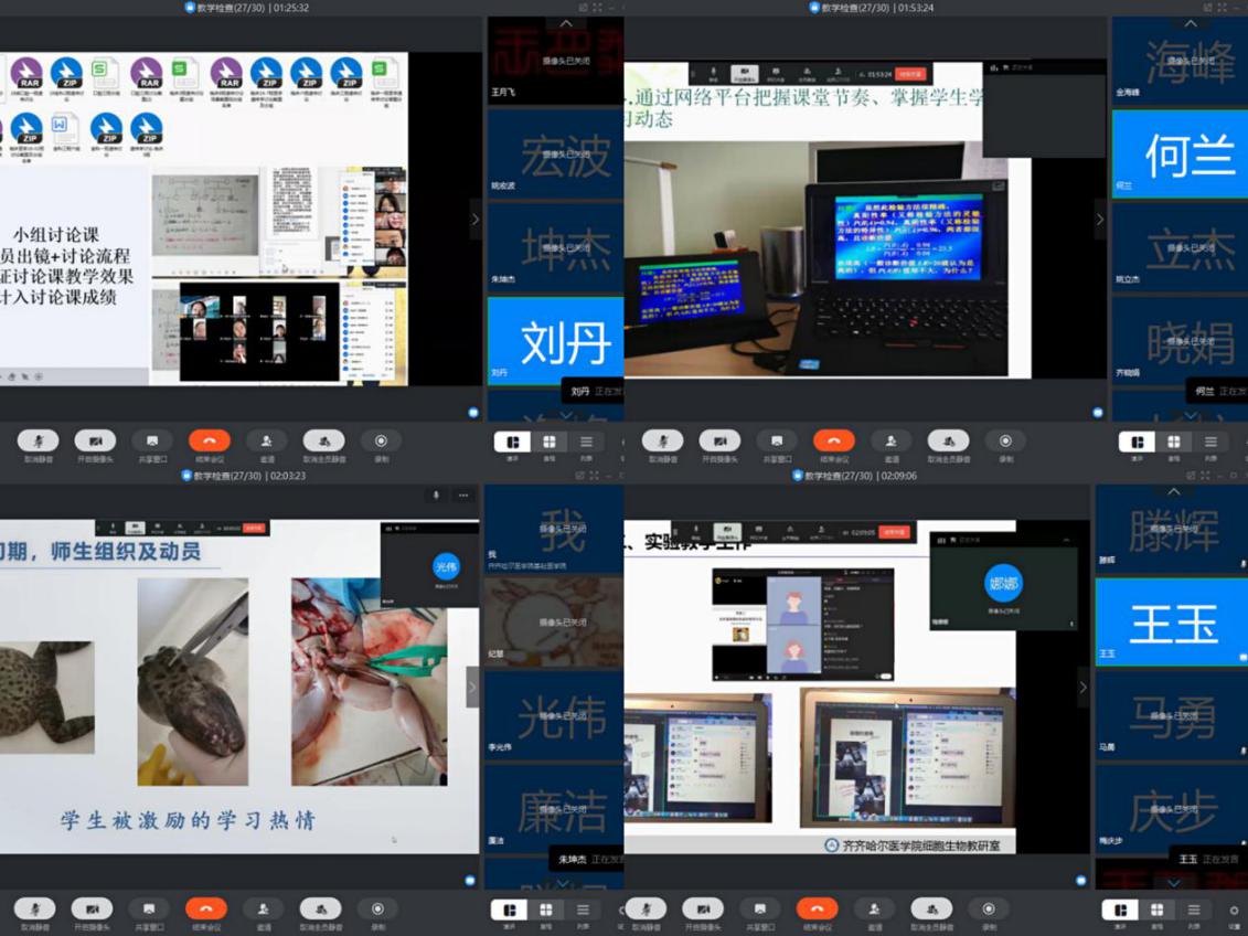 为了确保在线教学质量,本学期教学督导专家采取随机网上听课、组织学生网上评教等方式对教学过程、教学效果进行质量监控。督导组专家王滨教授和郑立红教授对本学期线上教学质量监控工作做简要总结,既对教师们教学设计、教学方法、师生互动等方面的特色和亮点给予肯定,同时也指出教学中发现的问题,如新教师的知识储备和应变能力还有待提高,网络卡顿和硬件条件等影响授课效果和学生听课感受,如何调动学生学习主动性等,并提出具体解决方案。