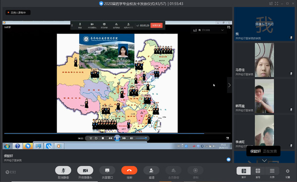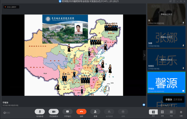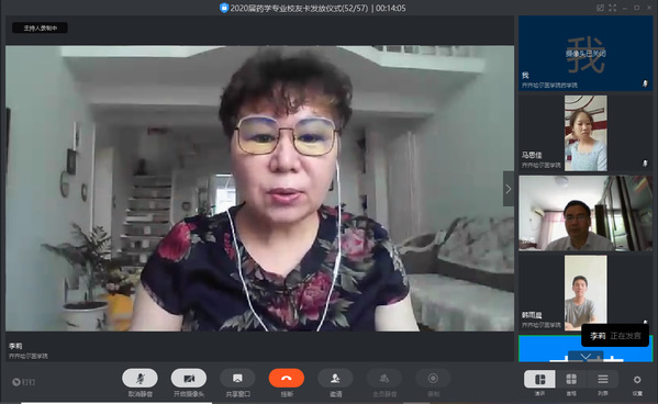 又是一年毕业季,今年的毕业季确与以往不同,虽然学生不能像以往一样如期返校,但距离隔不断浓浓的校友情、师生情、母校情。7月3日下午13:00-15:30,药学院2020届毕业生云端校友电子纪念卡颁发仪式在满满的温情中举行。校友电子纪念卡发放仪式以专业班级为单位举行, 药学院党委书记兼副院长弓箭、院长兼党委副书记李莉、党委副书记兼副院长韩翠艳、副院长崔红霞、各专业负责人及专业课教师、2020届药学院全体毕业生参加了此次活动。