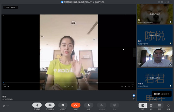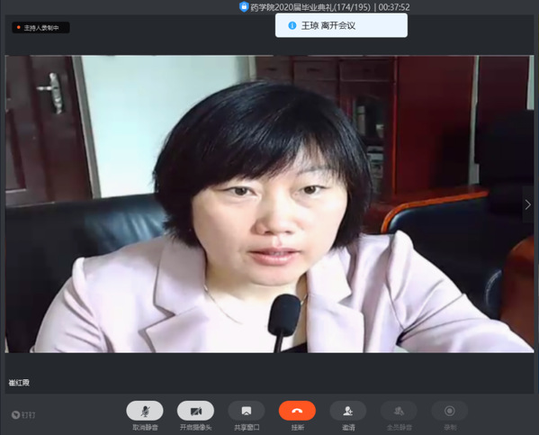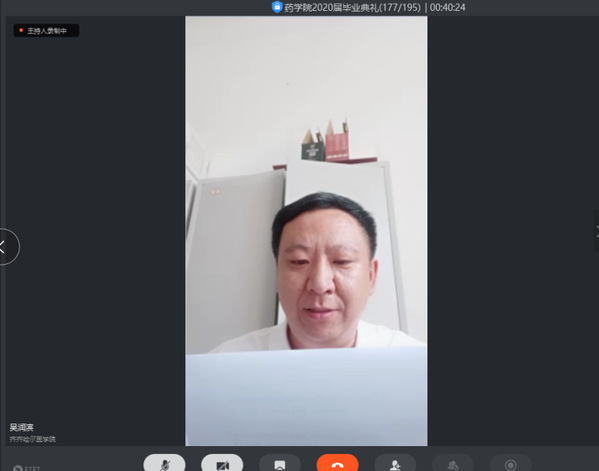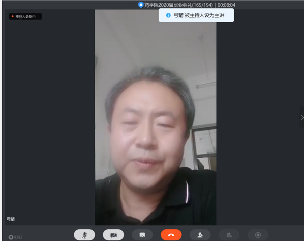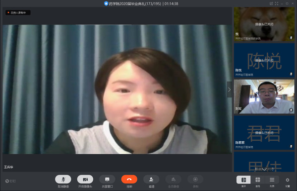 七月,夏天的味道,伴随着初夏的微风,一个特殊的毕业季如期而至。7月2日上午9:00,我院2020届毕业生云毕业典礼隆重举行。虽然没有现场观礼的学生,没有宽阔的会场,但庄严隆重的氛围仍在,学院对即将远行学子的不舍、祝福与思念不仅没变,更比以往浓烈。药学院党委书记弓箭,院长李莉,副书记韩翠艳,副院长崔红霞,教师代表以及辅导员和毕业班班主任全体参加了典礼,会议由韩翠艳副书记主持。身在各地的160名毕业生与母校心系一处,在云端与母校共同见证毕业的庄严时刻。