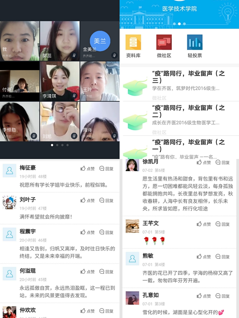 10个毕业班的班主任分别利用钉钉平台开展班级主题班会和畅谈会,了解学生的就业心态、就业打算,指导学生如何顺利进行角色转化;利用易班平台开展毕业生赠言、“疫”路同行,毕业留声、校园美景独家记“易”活动,定格留存大学的每一个美好瞬间;利用QQ、微信与学生进行“云”谈心,帮助学生解决择就业和从职过程遇到的问题。同时,倡议2020届毕业生为学弟学妹捐赠书籍和生活用品,为学弟学妹们提供帮助和送去祝福。