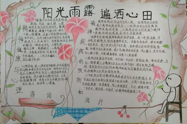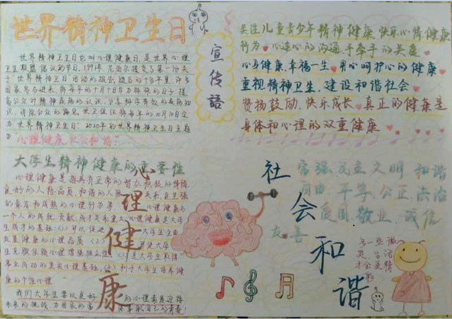 同学们的海报中流露着对心理学知识的热爱,展现出同学们对“世界精神卫生日”内涵的了解,以及对这一纪念日的看法和关注。此次活动不仅使同学们了解了精神卫生日,认识到精神卫生的重要性,更增加了同学们对心理健康问题的重视,提高了同学们的心理健康素质,让同学们的专业知识得到了巩固,提升了学生们的专业认同感。