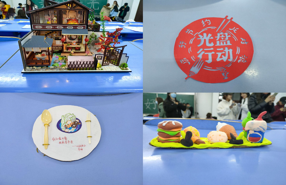 本次活动以主题作品制作、展览、评比的形式展开。活动过程中,同学们以“餐厅不多点、食堂不多打、厨房不多做”为宗旨,充分发挥自己的动手能力和创新思维,制作出一个个主题鲜明、独具特色、制作精美的作品。25日下午在北区203,通过展览会的形式,对学生们制作的手工品进行了展览,参赛同学进行了现场讲解和介绍,并呼吁同学们要树立节约意识。26日至28日,公共卫生学院团总支将部分优秀作品上传至易班平台进行了线上投票,推选出了同学们心目中的优秀作品。