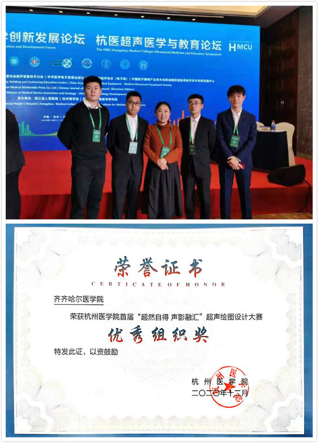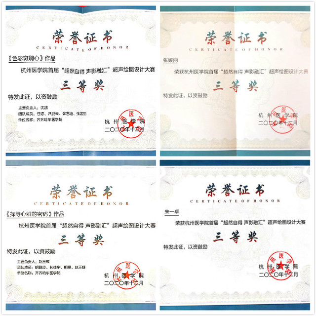 本次比赛共收到63幅作品,评选委员会由国内超声医学专家、专业绘画师及专业教师组成,共评选出大赛一等奖4名、二等奖7名、三等奖10名以及优胜奖。我校共提交9幅作品,其中2018级医学影像学专业学生赵玉蝶,张媛丽,沈超和朱一卓四名同学喜获大赛三等奖,李禹欣、王小艺、李乐炜、宋鸿俊和张艺迪五名同学获得大赛优胜奖,我校荣获优秀组织奖。