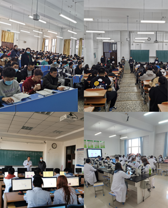线下授课第一天,基础医学院领导班子全体成员深入课堂,对本院当日授课的6门课程(12学时理论教学,58学时实验教学)学生的到课情况、听课状态、教师的课前准备及授课情况等全面进行巡查。整体教学秩序良好,教学工作有序开展,教学设备运转正常;任课教师按时到岗,教学准备充分,授课热情饱满;学生整体状态良好,出勤率高,听讲专注,课堂秩序井然。