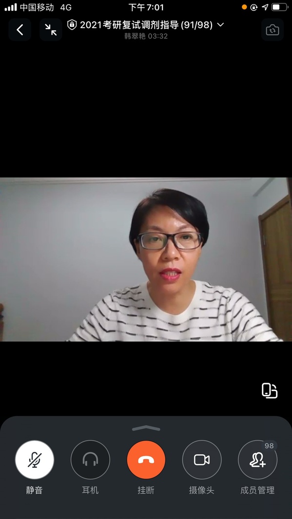 会上,院长韩翠艳就考研线上复试全过程进行了辅导,从网络调试、机位摆放、光线调整、面试形象、面试地点选择、专业知识和外语的准备、面试回答注意细节、调剂院校选择等问题做了一一指导。
