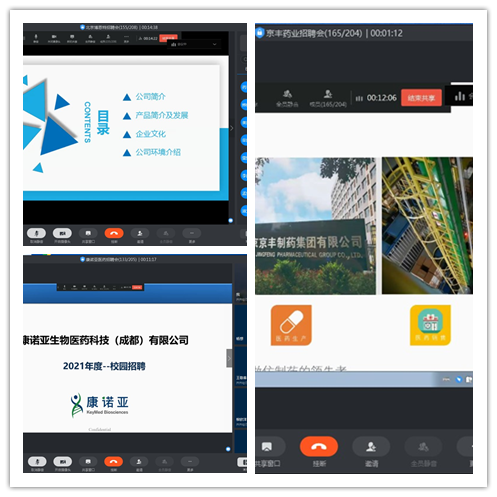 药学院近期共举办10场线上小型聘会,参会企业分别为北京京丰制药集团有限公司、北京恒生药业有限公司、北京森隆制药有限公司、北京博恩特制药有限公司、江苏万邦药业有限公司、北京星昊医药股份有限公司、上海药明康德新药开发有限公司、北京创立科创医药技术开发公司、康诺亚生物医药科技有限公司、葵花药业集团医药有限公司。