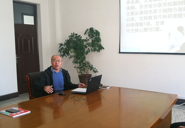 李永涛教师根据从2018年9月至今所做的科学研究项目,以《基于网络药理学探究CXCL-13对间充质干细胞增殖和迁移的影响》为题进行了汇报交流,详细讲解了项目的背景、立题及相关实验。与会教师就间充质干细胞、网络药理学等方面与李永涛教师展开了深入交流。