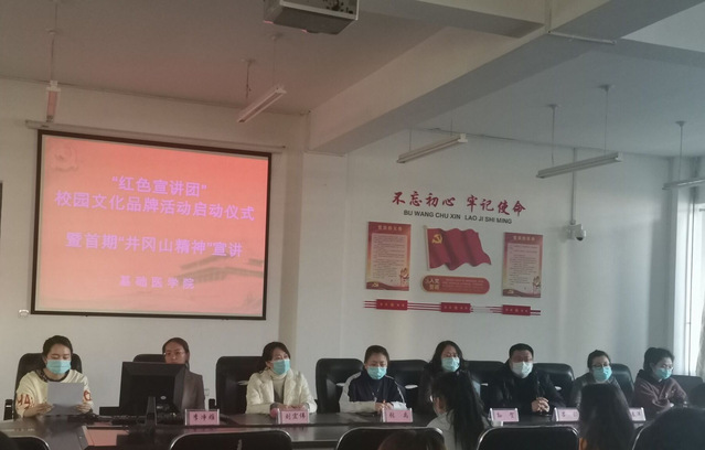 3月24日,基础医学院 “红色宣讲团”校园文化品牌活动启动仪式暨首期“井冈山精神”宣讲活动在主楼南区350会议室召开,基础医学院学生工作副书记孙贺参加活动并致辞,马克思主义学院李净雅老师受邀做首期活动宣讲。李净雅老师从井冈山精神的形成、重要意义、科学内涵、时代光芒等几方面带领参会同学回顾了革命先烈浴血奋战、艰苦奋斗的红色足迹。会后,同学们表示回顾历史让自己热血澎湃、斗志倍增,纷纷期待下期活动。