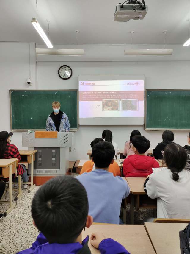 活动中同学们积极上台分享革命先烈故事,解读他们的革命精神:邱少云同志为了完成潜伏任务不暴露自己,在烈火中放弃自救,咬紧牙关在烈火中坚持30多分钟直至壮烈牺牲。雷锋同志作为一