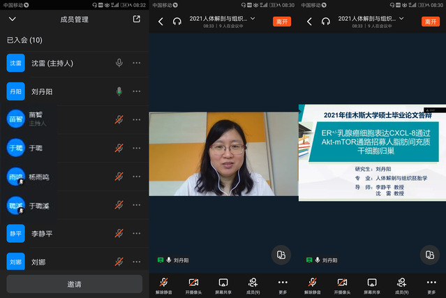 2021年4月2日,基础医学院组织佳木斯大学人体解剖与组织胚胎学科召开了2021年人体解剖与组织胚胎学硕士研究生网络预答辩。佳木斯大学医学部常务副部长宋汉君教授、齐齐哈尔医学院李静平教授、沈雷教授等21名博硕士研究生导师及其学生参加了本次网络预答辩。
