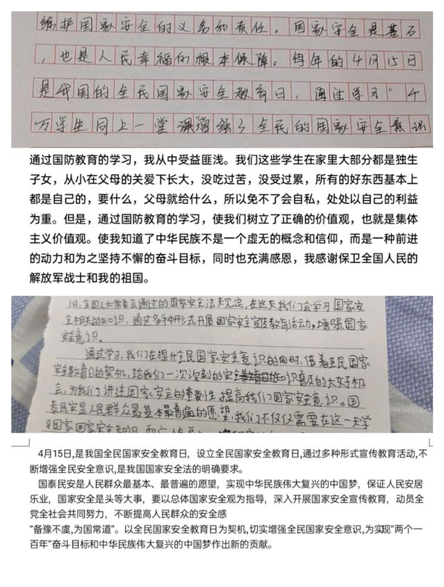 其次,开展了“全民国家安全教育日”学习感悟活动,同学们踊跃上交自己的国家安全见解和教育心得,体现了新时代青年人维护国家安全的责任感。