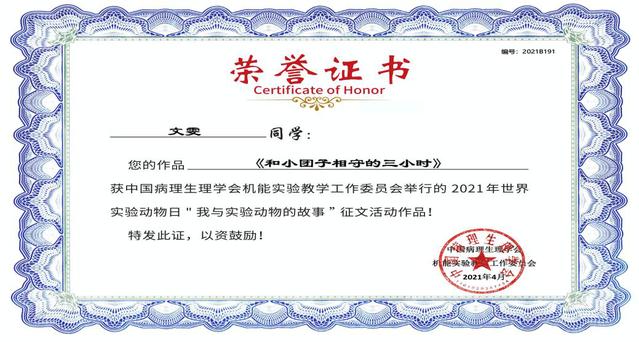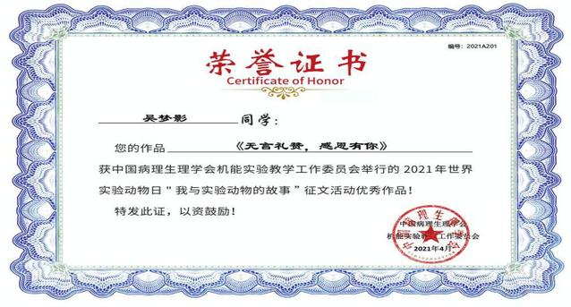我校接到征文大赛通知后,以“我与实验动物的故事”为主题面向全校学生征集优秀作品,各院系学生积极参与,踊跃投稿,抒发对实验动物的感激之情和医学伦理的认知。评审组共接收征文作品20篇,经评审专家组匿名评审,推选出6篇优秀征文作品,每位参赛学生在指导教师的帮助下,结合评审专家给予的建议再次进行了细致的修改与完善。最终,推荐6篇优秀征文作品代表我校参加中国病理生理学会机能实验教学工作委员会举办的世界实验动物日活动之--“我与实验动物的故事”征文大赛。近日获悉,经中国病理生理学会机能实验教学工作委员会终评,我校共有5名学生征文作品获奖。