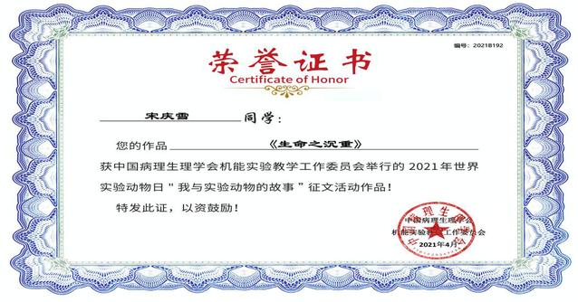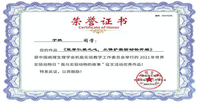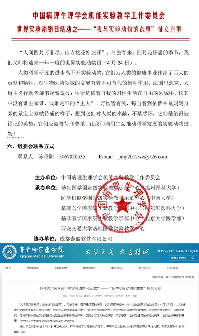 中国病理生理学会机能实验教学工作委员会在世界实验动物日(周)面向全国各高校在读本/专科学生开展征文活动,我校5名学生获奖,其中3名学生获得优秀作品征文。