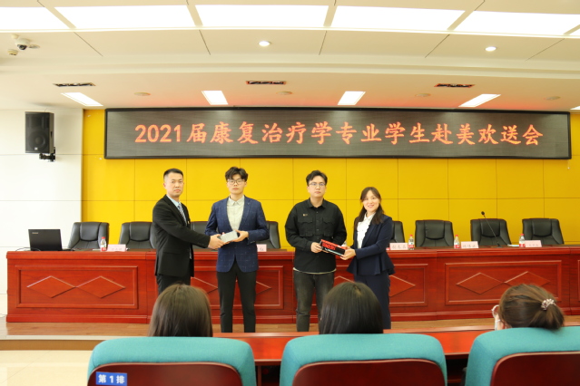 为拓宽学生升学渠道,促进多元发展,帮助学生进一步了解赴美留学项目政策,增加学生就读国外名校机会,2021年5月26日,医学技术学院于科技楼五楼学术报告厅举行了2021届康复治疗学专业学生赴美学习欢送会暨经验交流分享会,医学技术学院党委书记郭伟东、院长张春晶、辅导办主任逄丽红、办公室主任穆伟斌、附属第二医院康复教研室主任胡斌及康复治疗学专业各年级学生参加本次活动。