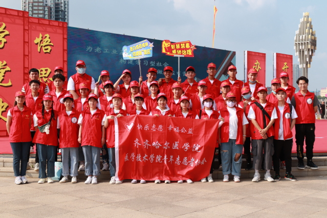 为进一步弘扬奉献、友爱、互助、进步的志愿服务精神,积极培育和践行社会主义核心价值观,推动党史学习教育和志愿服务活动深入开展,6月27日,医学技术学院团委组织了80名学生志愿者参加了在劳动湖音乐广场举行的齐齐哈尔市“迎庆建党百年•鹤城志愿同行”主题志愿服务系列活动暨启动鹤城志愿服务集市仪式。