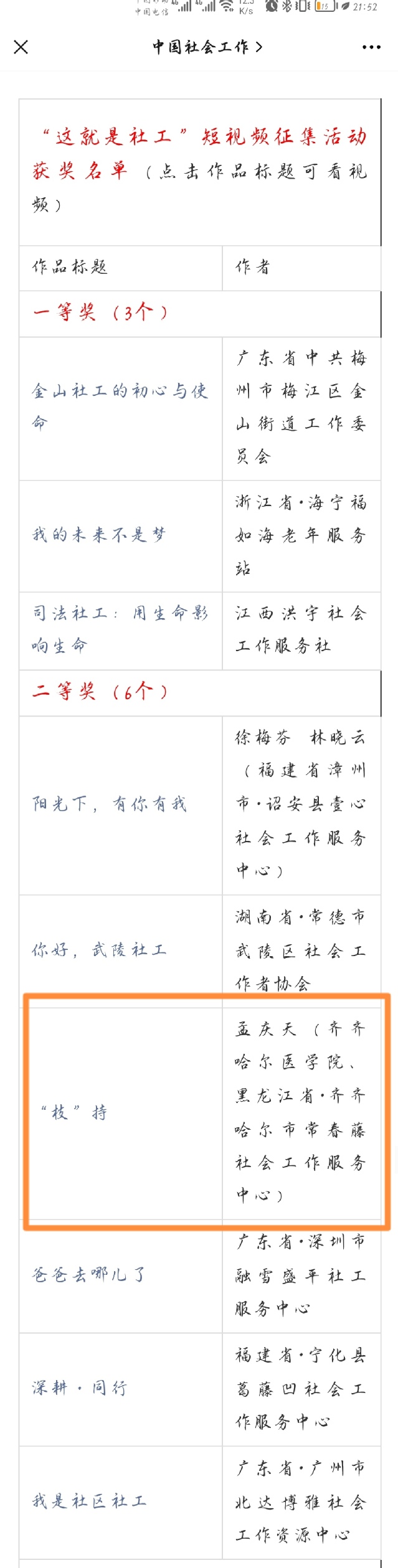 近日,由中国社会报社《中国社会工作》杂志主办的“这,就是社工”全国社会工作短视频征集活动评选结果揭晓,我院孟庆天老师团队报送的作品《“枝”持》斩获二等奖。