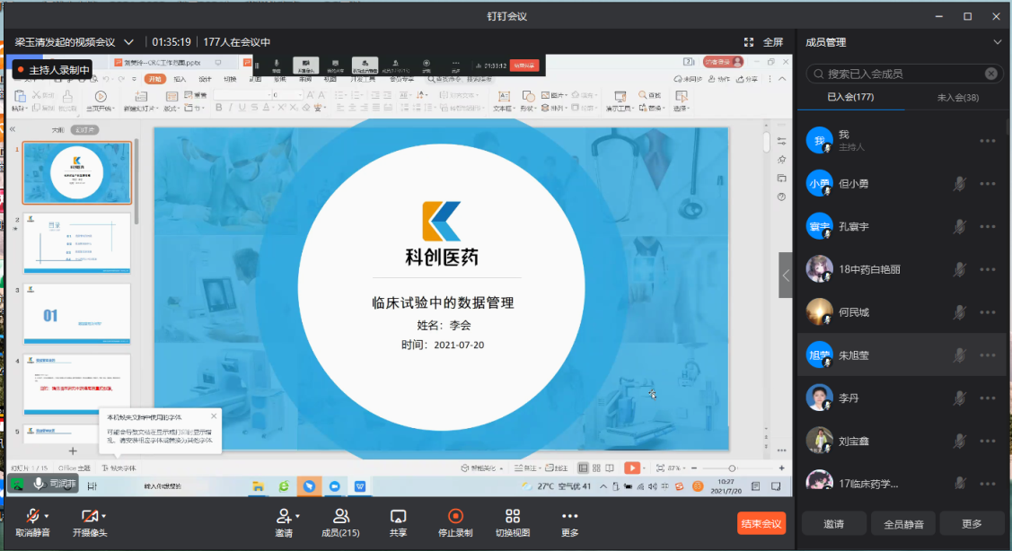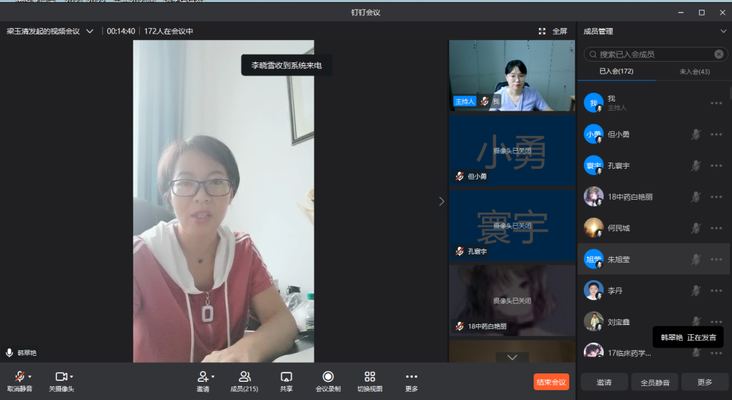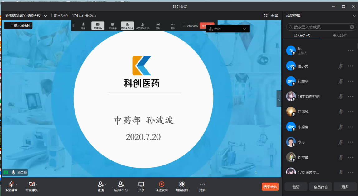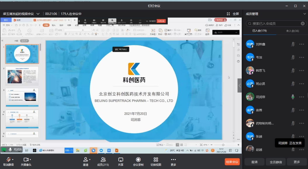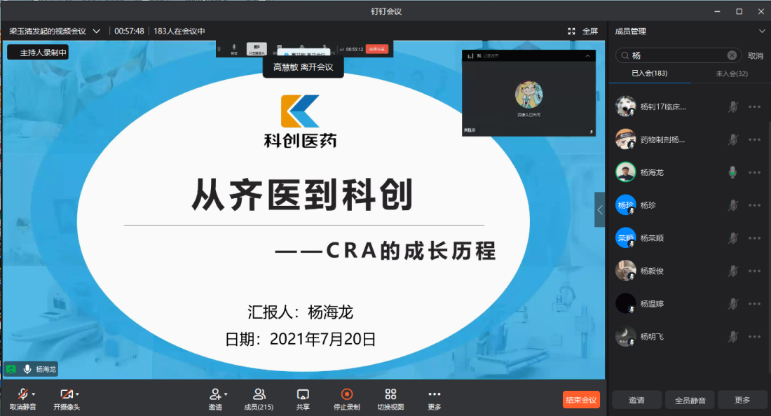7月20日上午9:00—12:00,药学院通过“2022届毕业生考研就业工作钉钉群”线上召开了“北京创立科创医药技术开发有限公司专场实习就业宣讲会”。院长韩翠艳、北京创立科创医药技术开发有限公司总经理和芳、党委副书记孔寰宇、北京创立科创医药技术开发有限公司人事经理司润菲、CRA岗位工作的杨海龙、CRC岗位工作的刘美玲、DM岗位工作的李会、实验员岗位工作的孙波波、毕业班辅导员、班主任及全体2022届毕业生、部分2021届有就业意愿的毕业生参加了会议。会议由辅导办主任梁玉清主持。