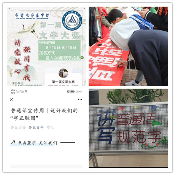 团委将推普同“学党史、强信念、跟党走”党史学习教育、“请党放心,强国有我”主题系列活动、弘扬中华优秀传统文化同部署、同推进、同落实,着重凝炼了爱国主义教育和传统文化教育两条主线,指导学生会组织和学生社团重点围绕这两条主线开展主题鲜明、各具特色的推普活动。校学生会在推普周期间启动了“请党放心 强国有我”第一届文学大赛。大学生社团管理部开展了“学四史”网上答题活动,通过回顾党史知识,从党史中汲取前行的力量,截至目前已有百余人参与答题竞技。学生社团也纷纷用自己的方式开展推普周活动。“校园之声”广播电台开展了红色经典诵读大赛暨展播活动,用声音铭记历史,用言语抒发爱国热情,72名学生参与录制,每周六推出“说文解字”专栏,推广中国语言文化;书法协会、武术协会等社团组织通过书法、武术等传统文化展示并录制视频等抒发爱国情怀;魔方协会通过拼图“讲普通话,写规范字”;大学生志愿服务部通过“普通话诵百年伟业 规范字写时代新篇”横幅签名活动等开展推普宣传,300余名学生参与活动。