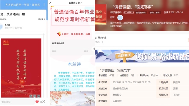 此次活动采线上的形式进行,在易班发布了“沟通,从普通话开始”的推文,各班级在微社区发布了“请讲普通话,方便你我他”、“ 说标准普通话,做文明中国人”的微话题,利用医技向日葵推送了“说普通话,做时代青年人”诗词朗诵,并在线上进行了“讲普通话,写规范字”生僻字和常用字的比赛。活动过程中,大家热情高涨、积极踊跃,取得了预期效果。
