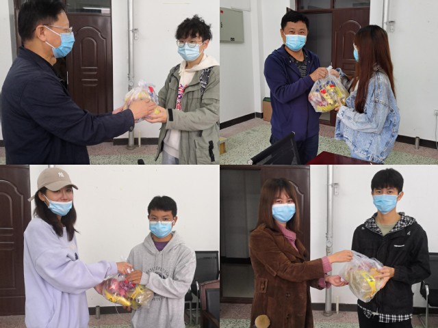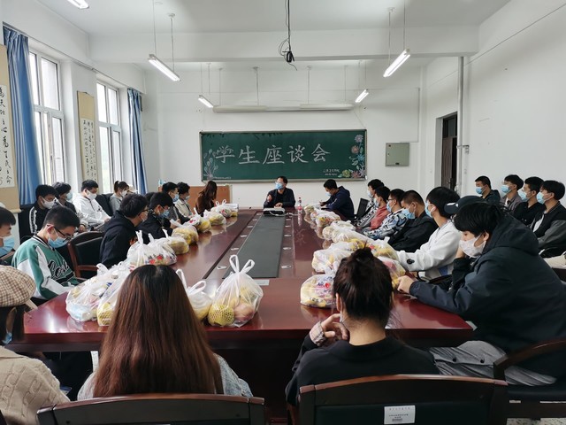 接着全体教师与部分同学进行了座谈,详细了解同学们在学习、生活中的困难,并向同学们介绍了学校对于大家在线上上课、生活中存在困难的帮扶措施。座谈会后,老师们向同学们发放了慰问品。