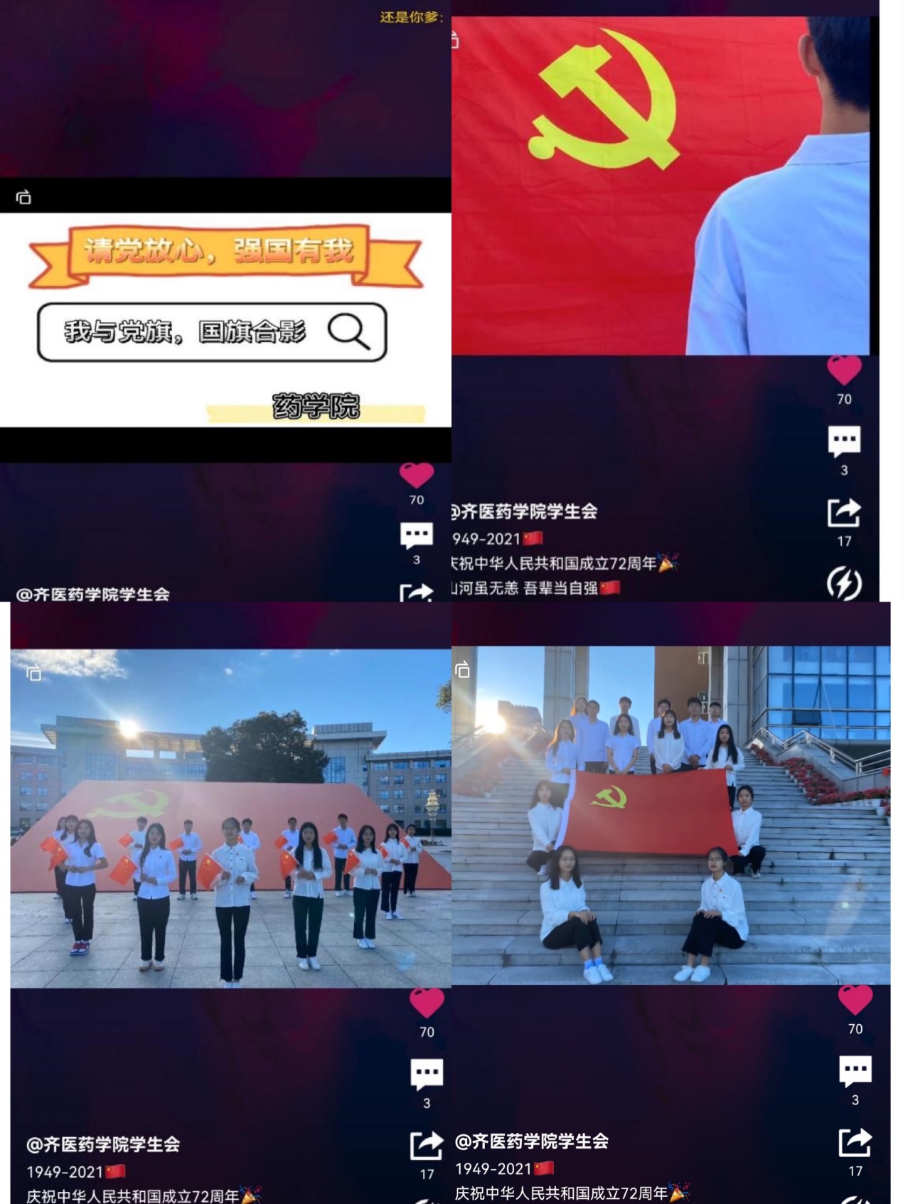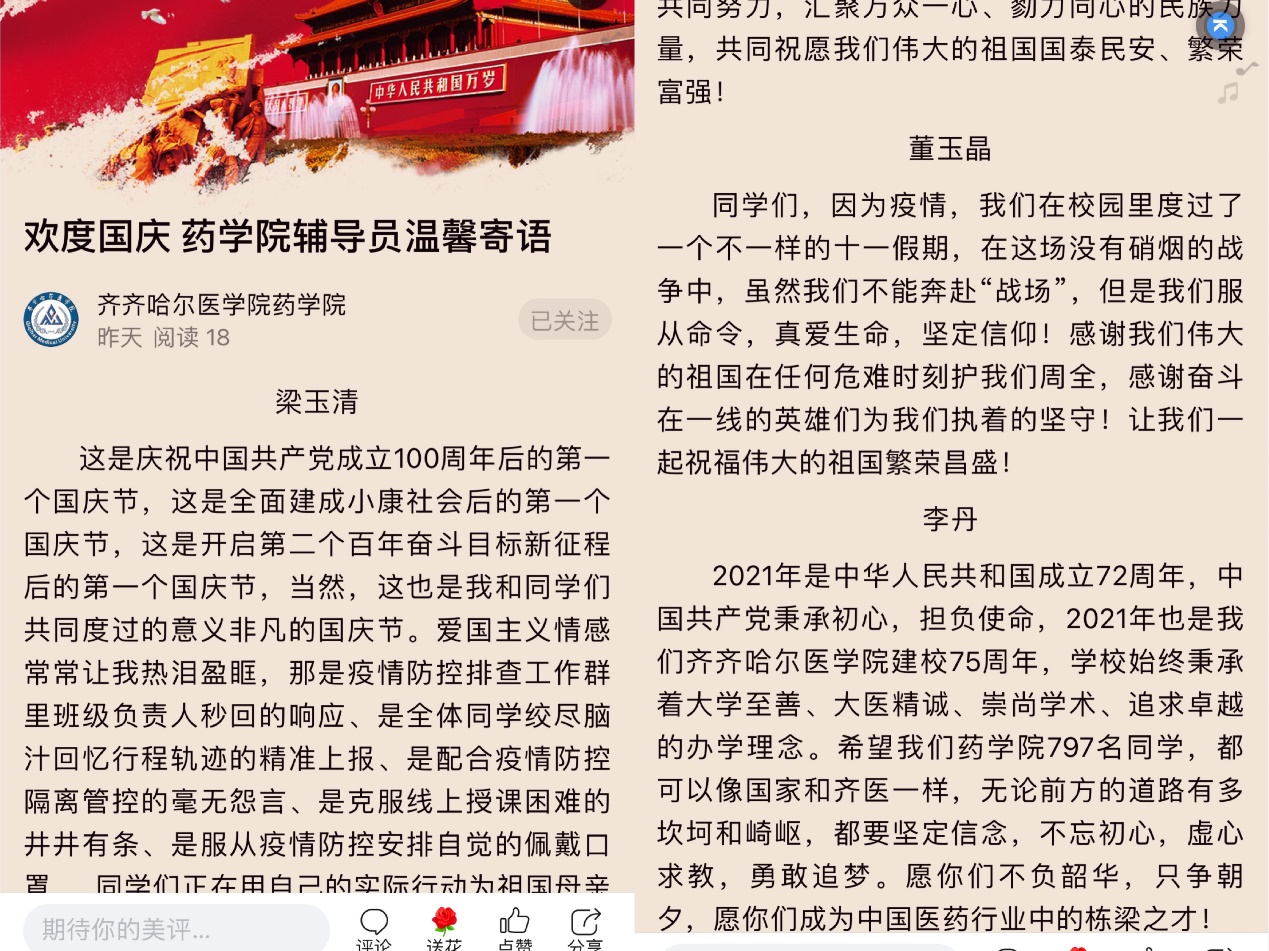 这个国庆注定意义非凡,在这个共庆祖国华诞的时刻,药学院辅导员老师为学生送上真挚寄语,勉励同学们将爱国主义牢记于心,以实际行动为祖国母亲庆生。