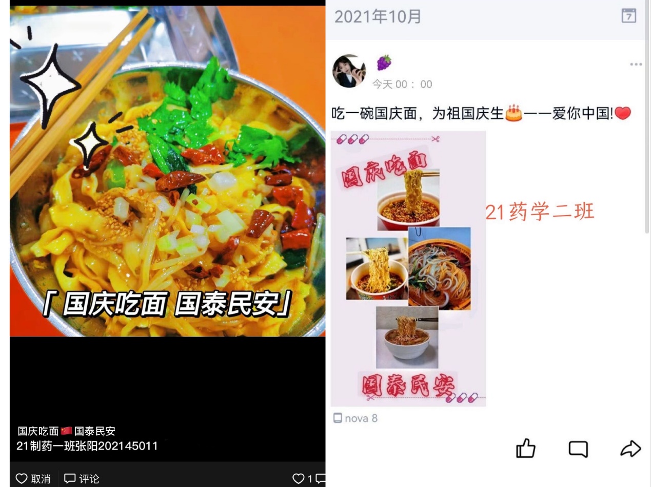 开展了“国庆吃面、国泰民安”新民俗活动。把过生日吃面的传统民俗融入到国庆活动之中,同学们纷纷晒吃面照片,为祖国庆生,表达对祖国母亲的美好祝福。