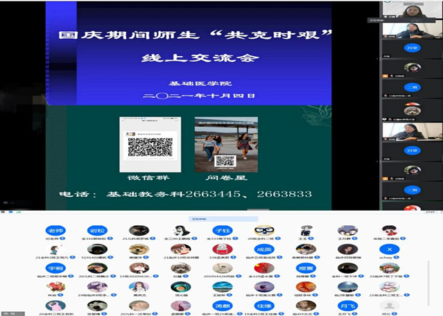 为庆祝中华人民共和国成立72周年,强化爱国主义宣传教育,营造欢乐祥和的节日氛围,根据黑龙江省委宣传部、黑龙江省教育厅相关文件精神,结合属地疫情防控要求和学院实际情况,我院于2021年10月4日以线上腾讯会议形式召开了国庆期间师生“共克时艰”交流会。基础医学院院长林岩、副院长纪慧、本学期有授课任务的全体教师、教务科全体和我院负责管理的各教学班学生代表参加了此次交流会,共计师生143人,会议由副院长纪慧主持。