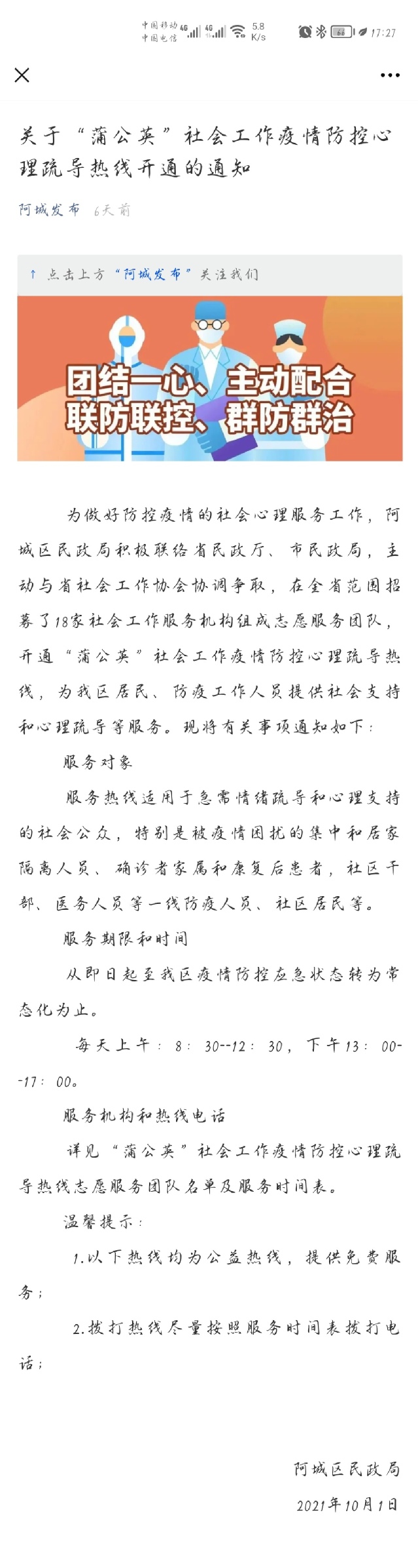 9月27日下午,齐齐哈尔市龙沙区华光社区疫情防控工作压力持续加大,第三支部迅速组织社工专业师生到达社区防控一线,在协助150余名社区居民行程码改码的同时,承担了社区居民流调等疫情防控工作。应黑龙江省“蒲公英社会工作疫情防控心理疏导热线”要求,“齐齐哈尔市心理援助热线”并入省“蒲公英社会工作疫情防控心理疏导热线”,自9月27日始每周一上午8:30-12:30,教师党员适时为疫区居民、防疫工作人员提供社会支持和心理疏导等服务。