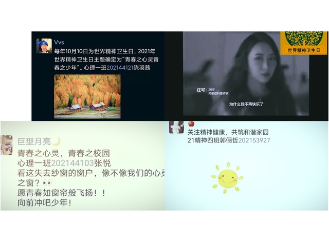 按照本次“青春之心灵 青春之少年”的活动主题,精神卫生学院从10月6号到10号相继举办了“疫散花开,阳光生活”、“青春之心灵,青春之少年”、“护佑心灵,幸福启航” 、“剪辑世界精神卫生日宣传片”、“青春之心灵,青春之校园”等一系列活动,通过绘制手抄报、主题海报、观看宣传片、社交平台转发正能量标语等形式,宣传“世界精神卫生日”, 帮助同学们正确认识情绪问题并采用适当的“调适”方法,引导人们正确对待精神类疾病、消除对精神疾病的认知偏见。