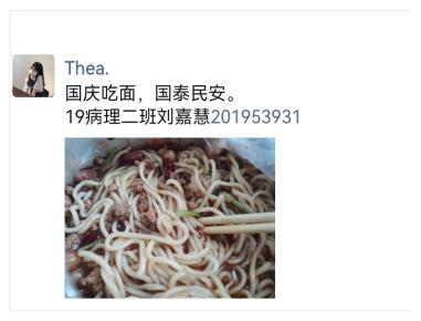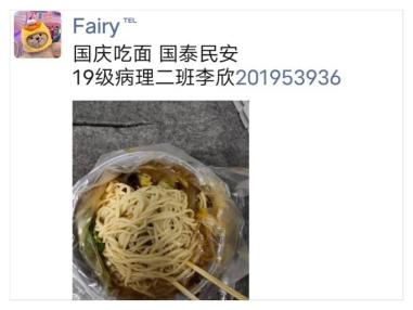 病理学院团总支于10月1日国庆节当天开展“我和我的祖国”暨“国庆吃面,国泰民安”主题活动,过国庆吃面与祖国共同庆生,进一步传承中国传统文化,感受中华美德。
