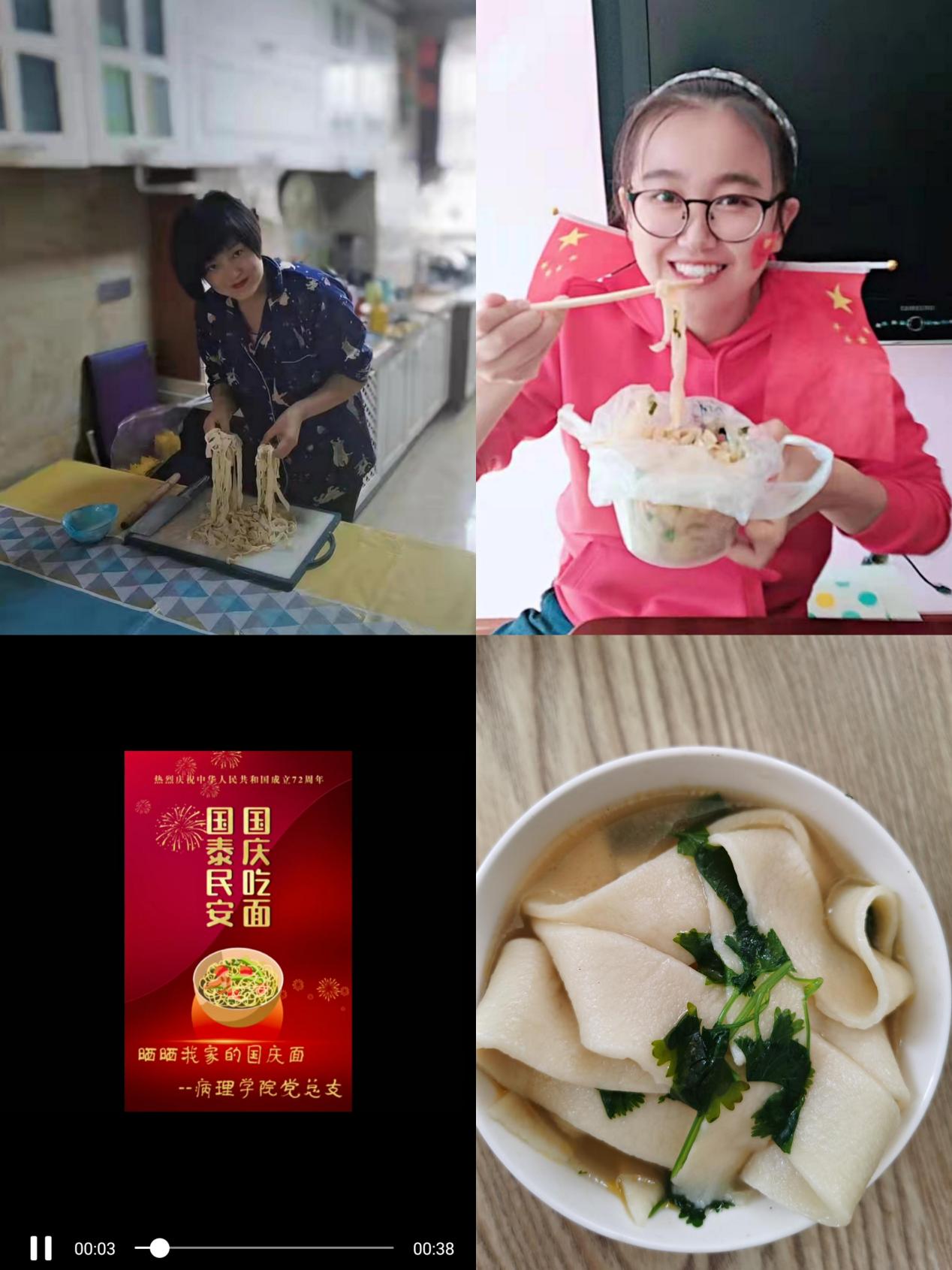 今年,国庆节吃“国庆面”,也成为了校园新时尚。国庆日当天,广大教师与家人共同制作、享用了一份份热腾腾的“国庆面”,党总支将大家拍摄的温馨照片,精心制作成小视频分享出来,传递了病理教师的爱国心声,祈愿国泰民安,祝福祖国繁荣昌盛。