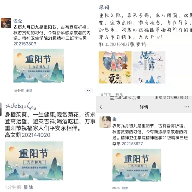 丹桂飘香金秋爽,岁岁重阳今又到,登高望远忆亲友,真心祝福早送上,菊花傲霜满地香,九九重阳福绵长。为了传承孝亲敬老的中华优秀传统,在今年“九九重阳节”到来之际,精神卫生学院团总支倡议在校学子开展“为家中的父母、长辈送祝福”活动。重阳节送祝福活动,是精神卫生学院团总支开展的“我们的节日”系列活动之一。活动的开展,不仅促进了学生孝亲敬老观念的养成,也推进了中华优秀传统文化在学生中的传承。