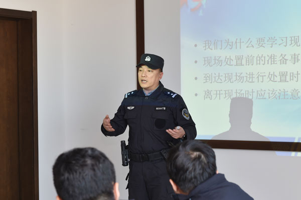 培训过程中,宋剑飞副所长以“校园安全事件现场规范化处置”为主题,结合多年的从警经验,从高校实际出发,采取现场互动交流的方式,详细讲解了校园安全事件处置过程中的现场控制、处置程序、注意事项、讯问笔录材料撰写过程中的细节问题、解脱与控制的小技巧等自我保护的方式方法,详细介绍了警棍、催泪喷剂、盾牌、应急棍、抓捕叉等常用警用器械的使用方法和注意事项,并现场组织校园安保人员进行了综合使用演练。