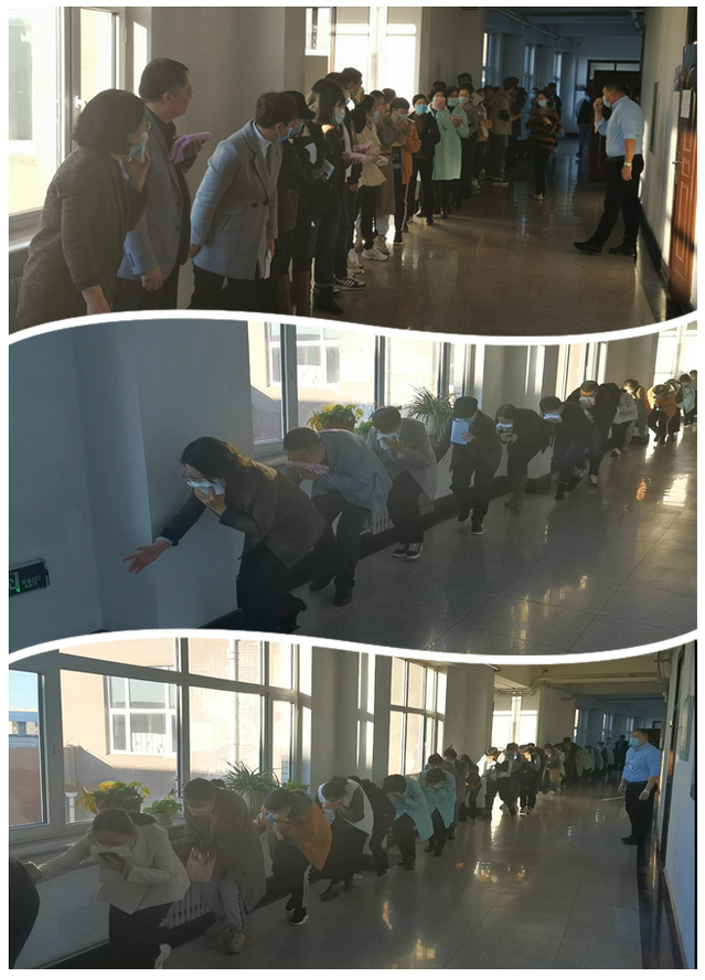 逃生演练前,演练领导小组进行了周密的部署,制定了疏散演练方案,确定了各部门人员分工及职责。27日下午15:20分逃生演练开始,随着教官的指令下达,全体师生立即用8层毛巾捂住口鼻,右手扶墙,半蹲前行,快速有序的疏散。演练结束后,教官针对此次疏散演练进行了细致的总结,并着重提醒了师生在逃生中应该注意的问题。