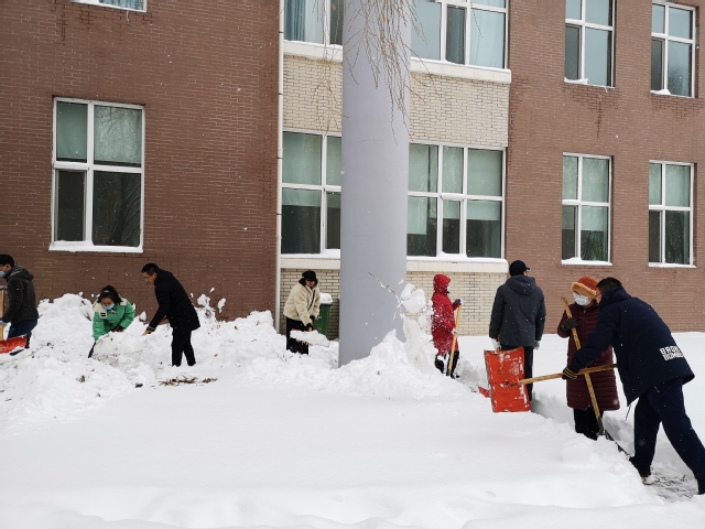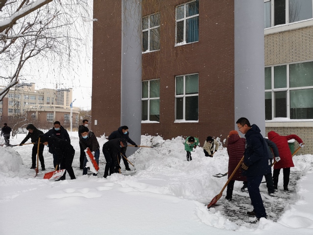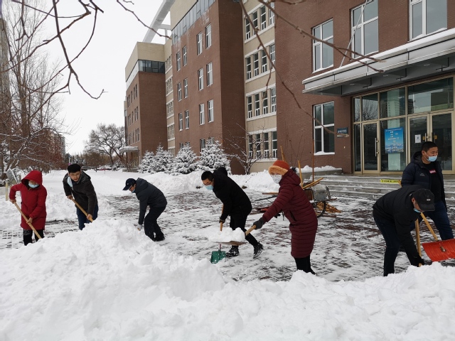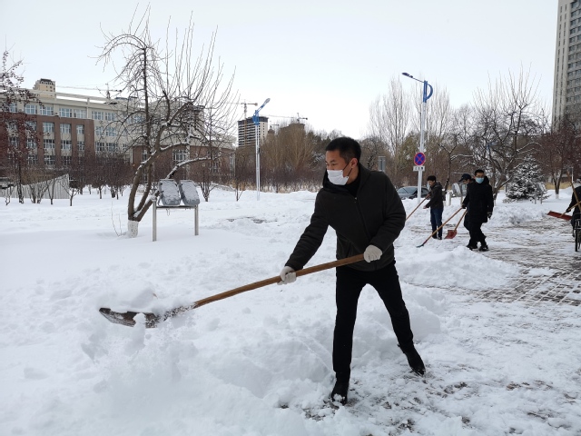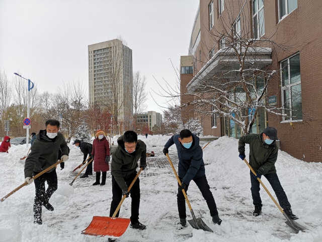 虽然天气寒冷,空中依旧飘洒着雪花,但这丝毫没有影响广大教职工参与劳动的热情。有些老师步行前往学校,有些老师1-2节下课以后就急匆匆赶来,有些老师已年近退休,有些老师刚刚结束空腹体检,那一个个忙碌的身影,成了皑皑白雪中最靓丽的风景。此次暴雪持续时间长,路面积雪深度达30-40厘米,教职工们不畏严寒、配合默契、连推带铲,齐心协力地投入到积雪的清扫过程中,大家劳动的热情和团结协作的场面让这个冬日变得温暖。受到教师们的感染,部分刚刚下课路过的学生和正在实验室的研究生们也纷纷投入到清雪工作中来。