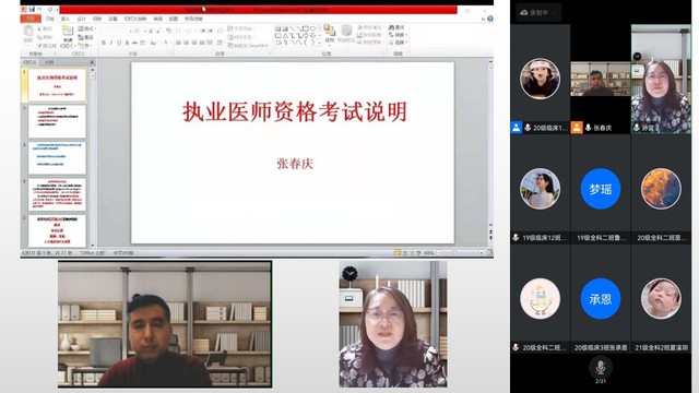 因疫情原因,此次活动以线上会议(腾讯会议)的形式进行,张春庆副研究员为学生们介绍了执业医师资格证的重要性,强调了执业医师资格考试的报考流程,考试类型等具体情况,并列举了考试原题,让同学们更加深刻直接的了解执业医师资格考试,最后张春庆副研究员针对执业医师资格考试提出相关建议,希望同学们可以参考借鉴。学生线上与张春庆副研究员积极互动,就目前学习与将来执业医师资格考试如何紧密结合进行交流,张春庆副研究员鼓励同学们要不负韶华,砥砺前行,努力照亮未来之路。讲座结束后,同学们纷纷表示此次活动让自己受益匪浅,认为本次讲座对自己的未来规划有着积极的指导意义。