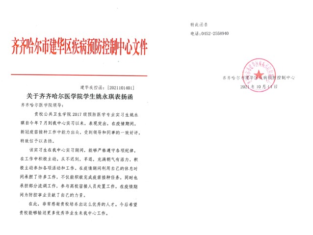 近日,学院收到一封来自齐齐哈尔市建华区疾病预防控制中心的表扬函件,对学院姚永琪同学在该中心实习期间的突出表现给予表扬。