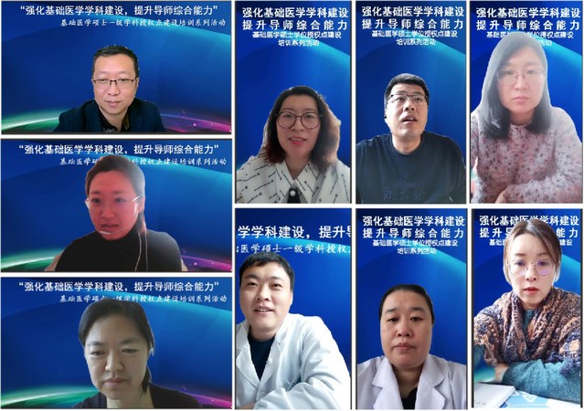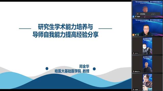 11月19日,基础医学院“强化基础医学学科建设,提升导师综合能力”系列培训活动第一讲在线开展,我院特聘教授哈尔滨医科大学郑金华教授主讲了《研究生学术能力培养与导师自我能力提高的经验分享》,会议由基础医学院院长林岩教授主持,院本部和附属医院硕士研究生导师、骨干教师等70余人参会。
