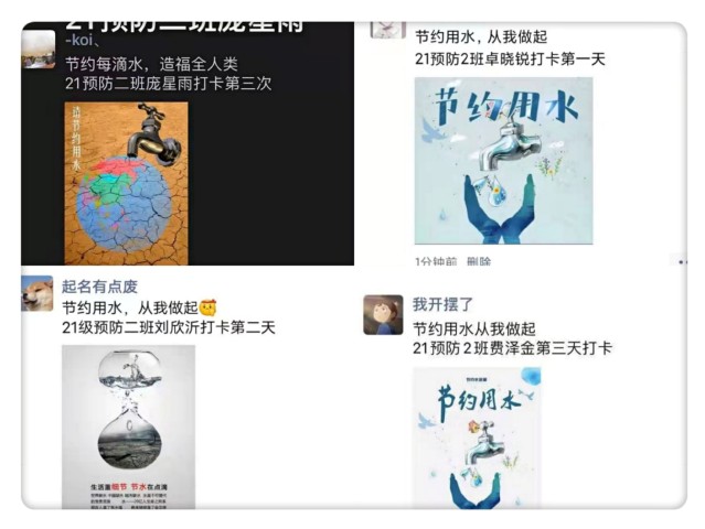 活动四:朋友圈打卡。同学们在网上选取自己喜欢的节约用水、保护水资源的宣传材料,在微信朋友圈连续打卡三天,在自己做好的基础上,也让家人朋友加入到了节约、保护水资源的行列中,扩展了活动范围,让活动变得更有意义。