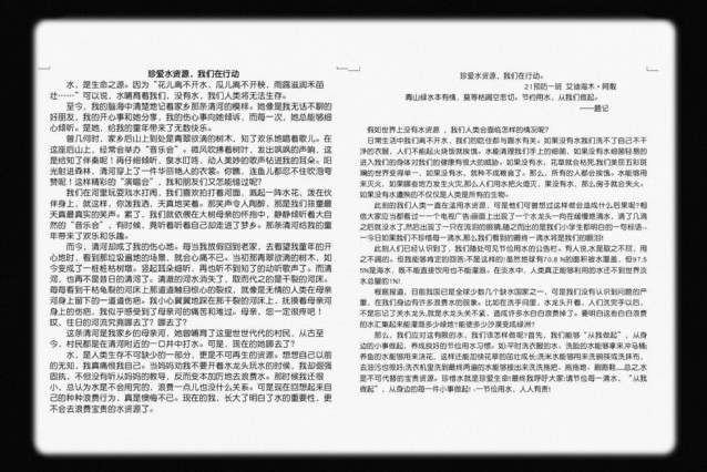 活动二:主题征文。在前期宣传的基础上,同学们认识到节约用水的重要性,主动围绕节约用水、保护环境进行了深刻思考,并撰写以“珍爱水资源,我们在行动”为主题的征文,将自己的感悟纷纷用文字的形式进行表达,时刻提醒牢记节约用水。