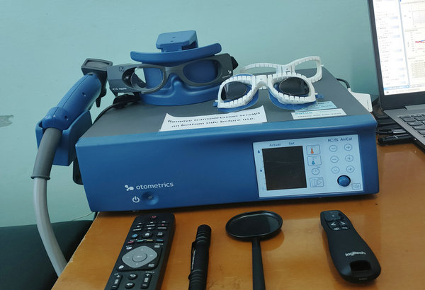 眼震电图室护理人员使用晕派思4.0眩晕诊断系统为患者检查