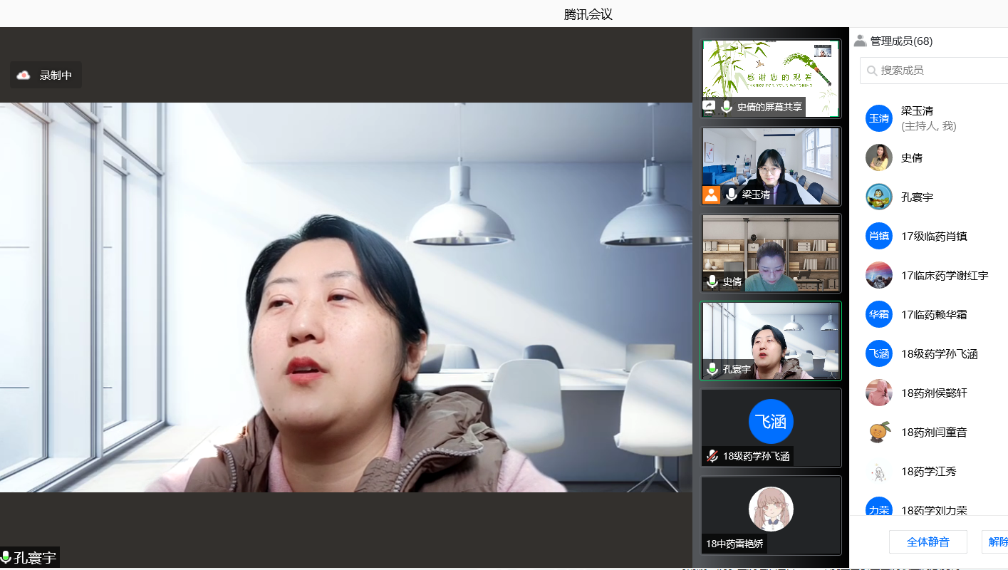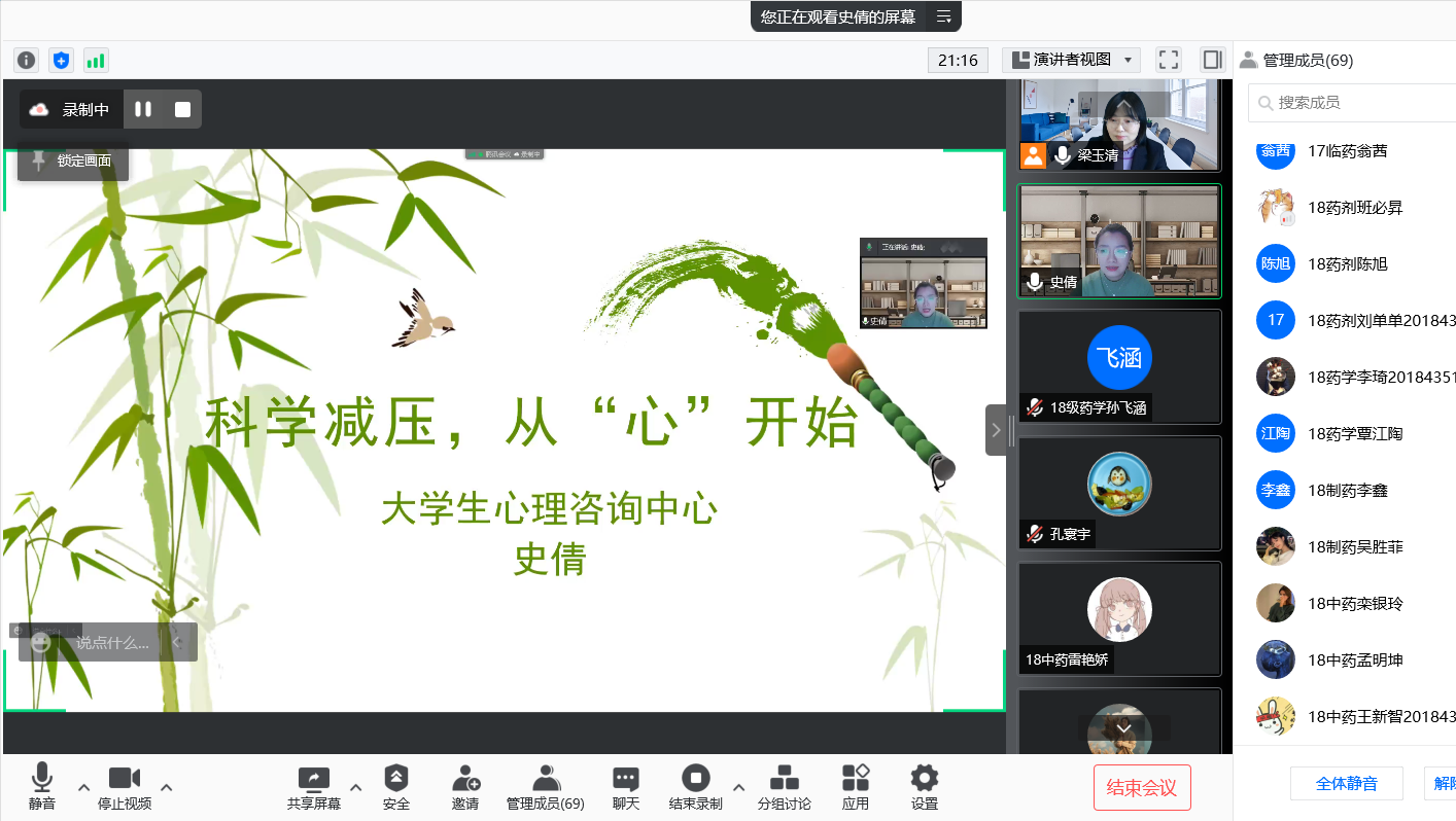 为疏导2022届考研学生考前心理压力,以积极心态迎接研究生考试,12月20日,药学院邀请大学生心理咨询中心史倩老师为同学们进行“科学减压 从‘心’开始”心理疏导。药学院党委副书记孔寰宇、2022届考研学生参加,会议由辅导办主任梁玉清主持。