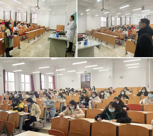 2月28日,学校春季学期第一课正式开讲。医学技术学院院长张春晶、党委副书记佡思维、副院长张浩率队深入教学一线检查开学第一天教学运行情况。