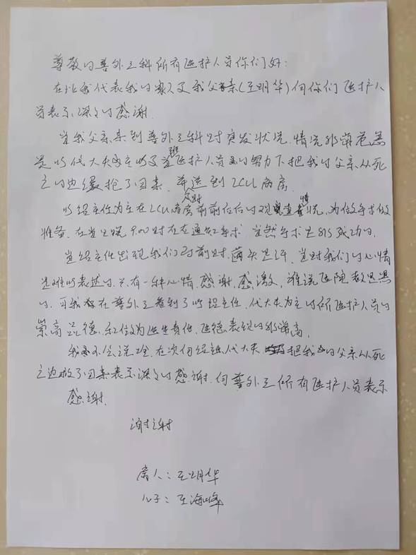 3月21日,患者痊愈出院了,患者对于邵学谦主任及医疗团队的救命之恩,感激无限,出院前眼角激动地流出泪花,紧紧握住邵学谦主任的手,老人非要鞠躬表示谢意,邵学谦主任拦下了。患者家属真诚地写下了一封感谢信,同时握住邵学谦主任的手,表达了最诚挚的谢意和感恩,诉说着对主任的感谢和救父之恩,也分享了本次住院的体验和感受。家属说,在附属三院普外三科,即便是保洁员也是那样和蔼可亲。